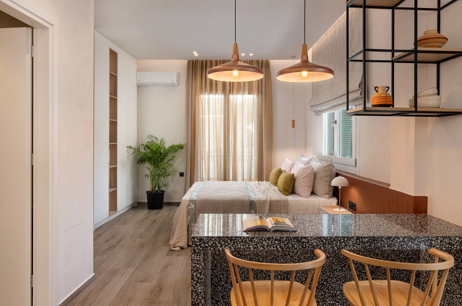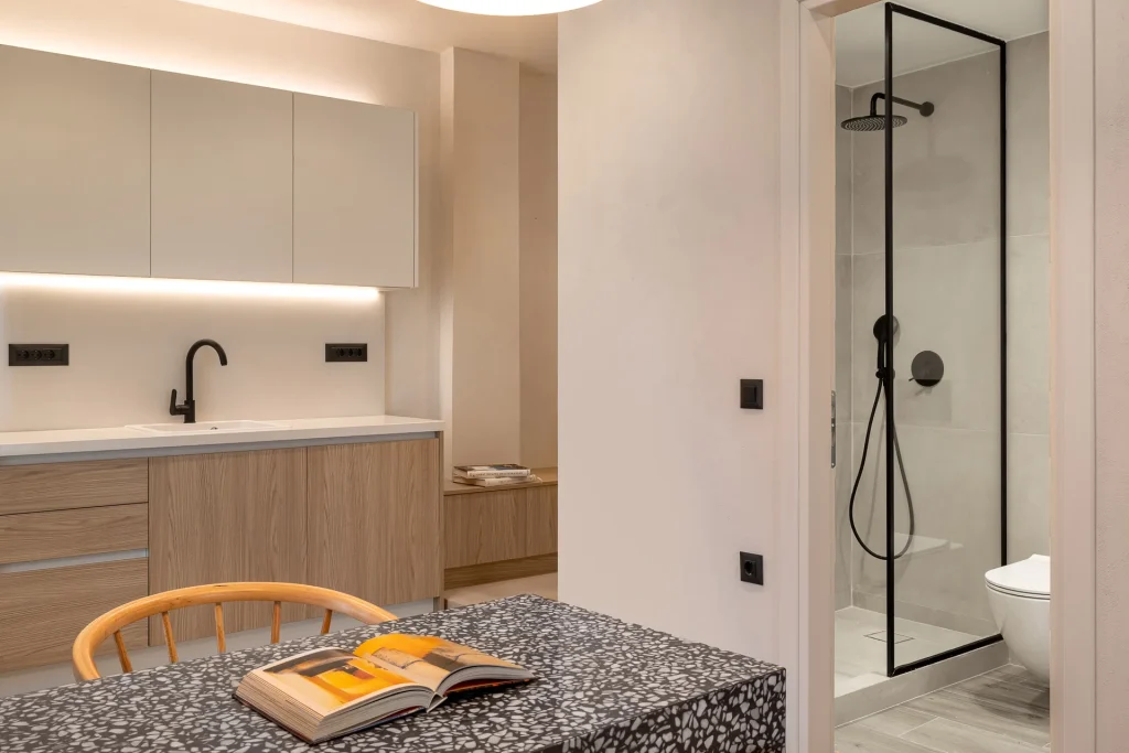 Comfortable Amenities: The apartment features air-conditioning, a private bathroom, and a fully equipped kitchen. Additional amenities include a washing machine, dining table, and soundproofing.
